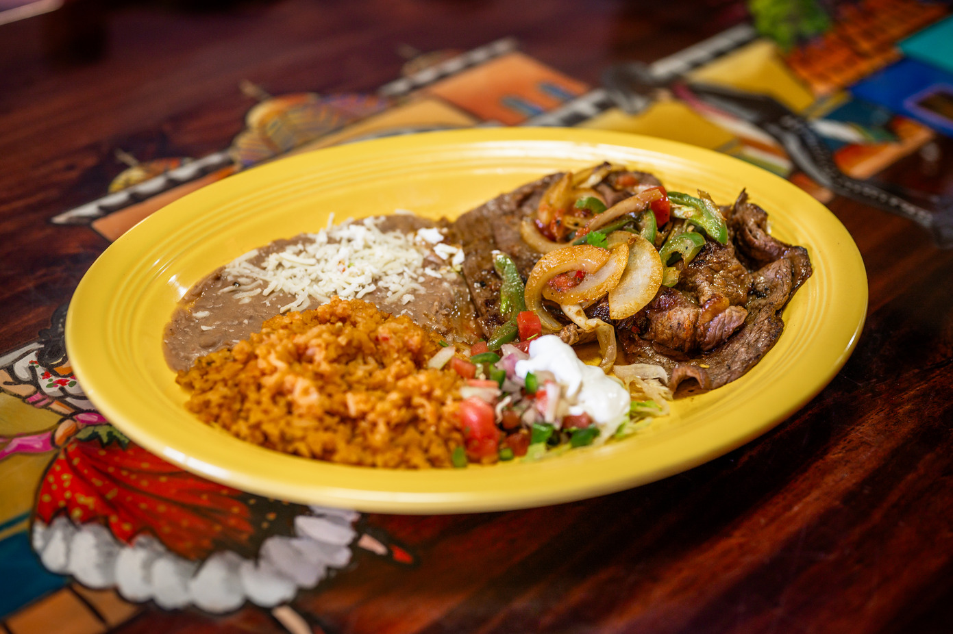 Grilled steak or grilled chicken breast served with sautéed onions and peppers, rice and beans.