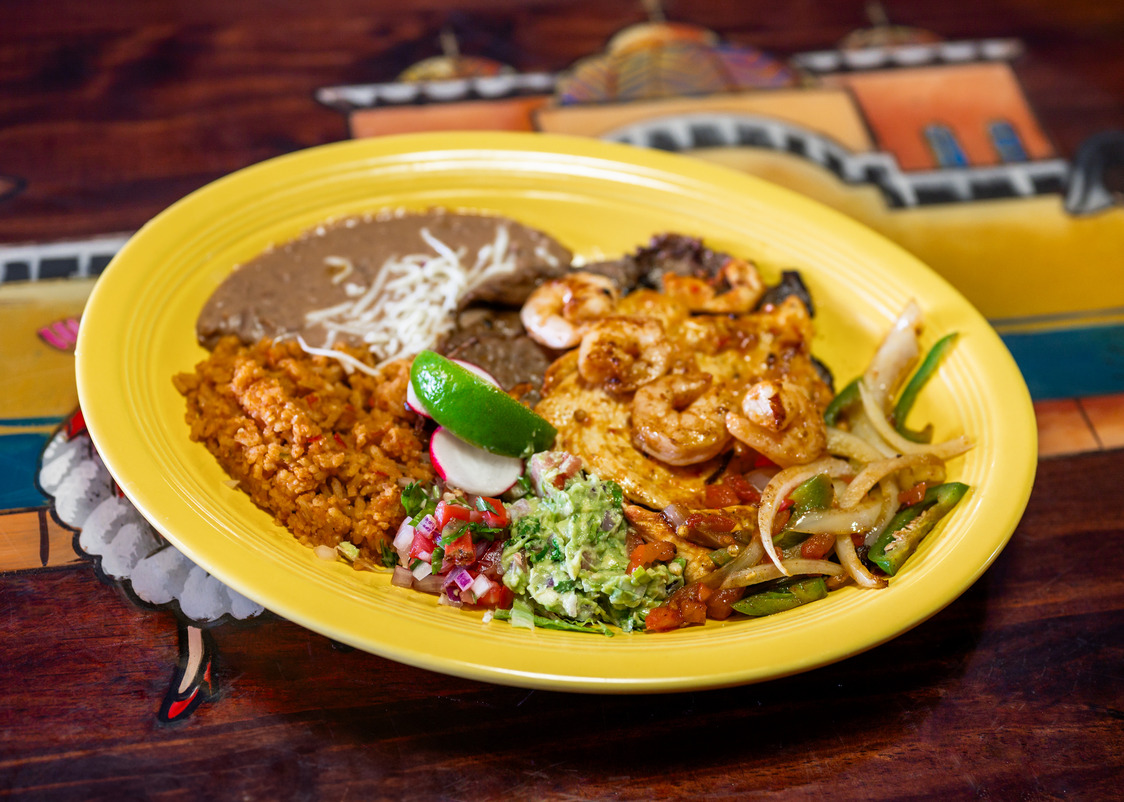 Grilled chicken, steak, and shrimp combo. Served with rice, beans, and tortillas.
