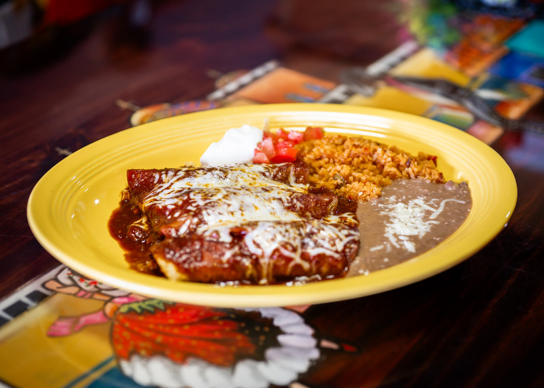 Two enchiladas topped with mole sauce and cheese. Served with rice and beans.
