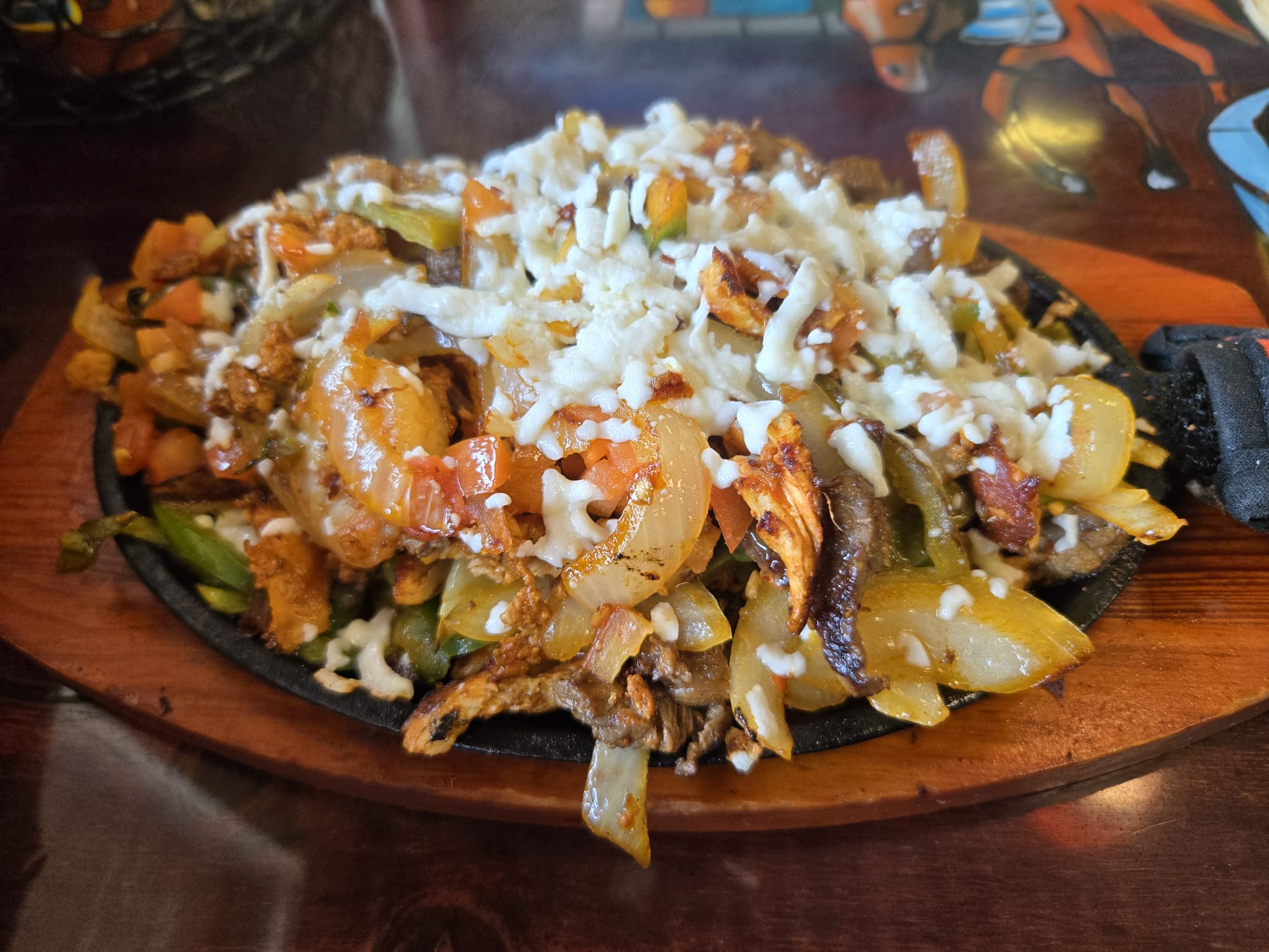 Grilled steak, chicken, shrimp, and chorizo with onions, fresh jalapeños, cactus, and tomatoes. Topped with queso fresco.