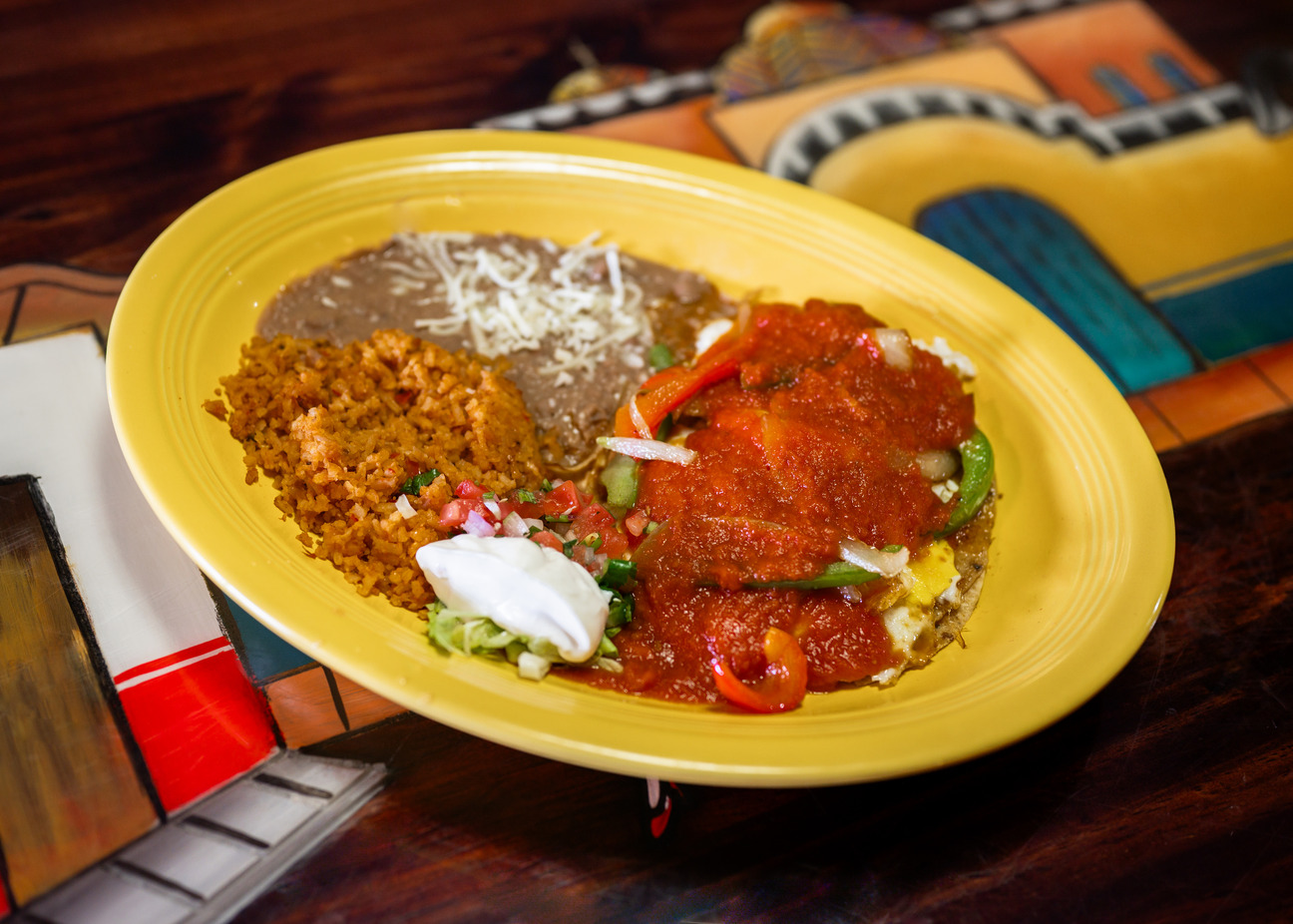 3 eggs cooked over easy covered with ranchero sauce, served with rice and beans.