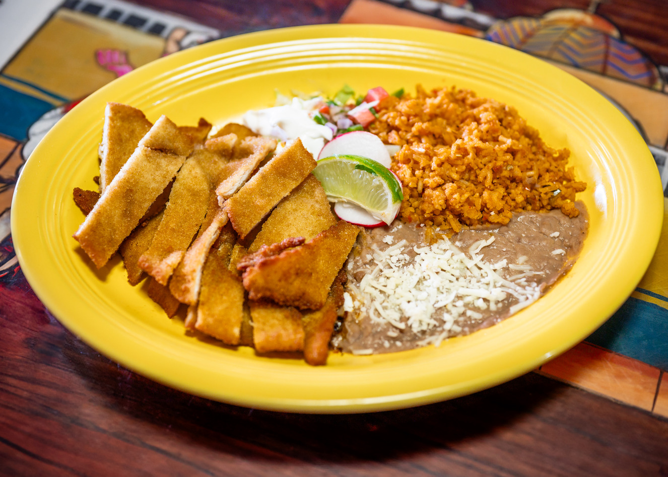 Breaded steak or chicken, fried golden brown. Served with rice, beans, and tortillas.