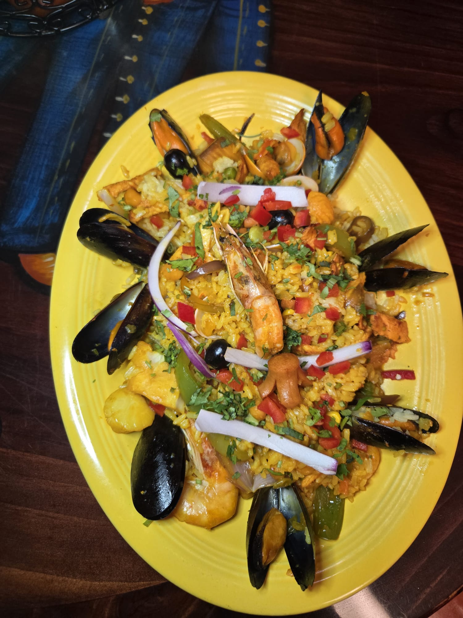 Traditional Spanish saffron rice cooked with shrimp, clams, mussels, crab flakes, scallops, chicken breast, sausage, bell peppers, onions, cilantro, green and black olives.