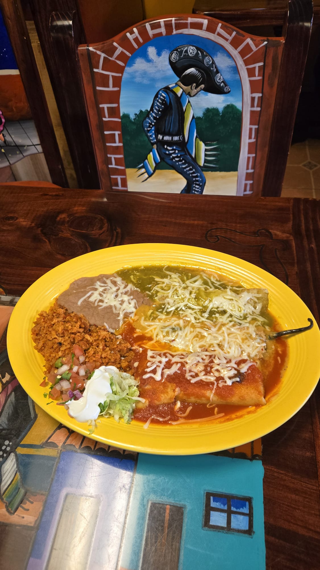 One chicken enchilada suiza, cheese chile relleno and one tamal.