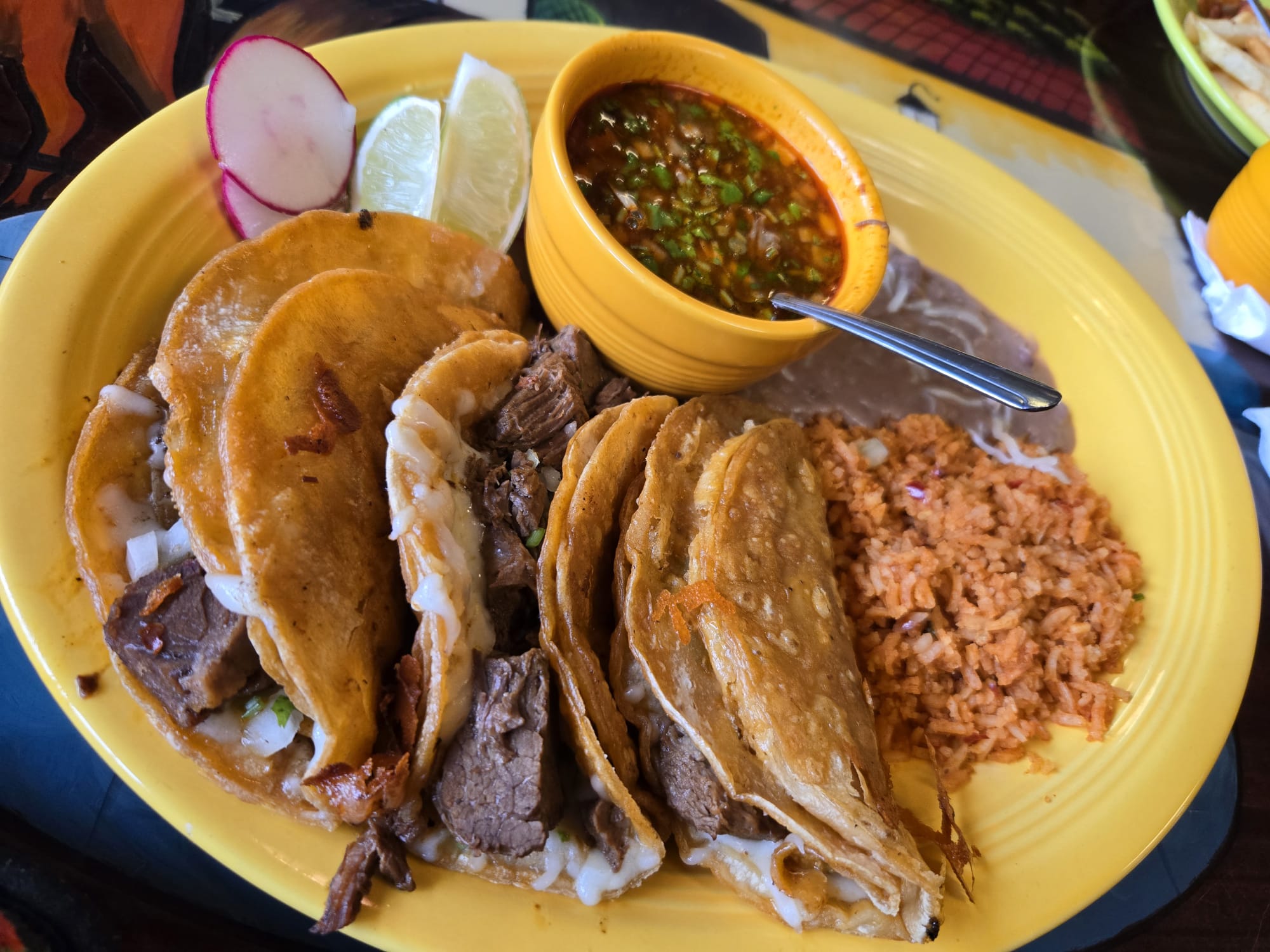 3 quesabirria tacos served with a cup of birria broth, rice, and beans.
