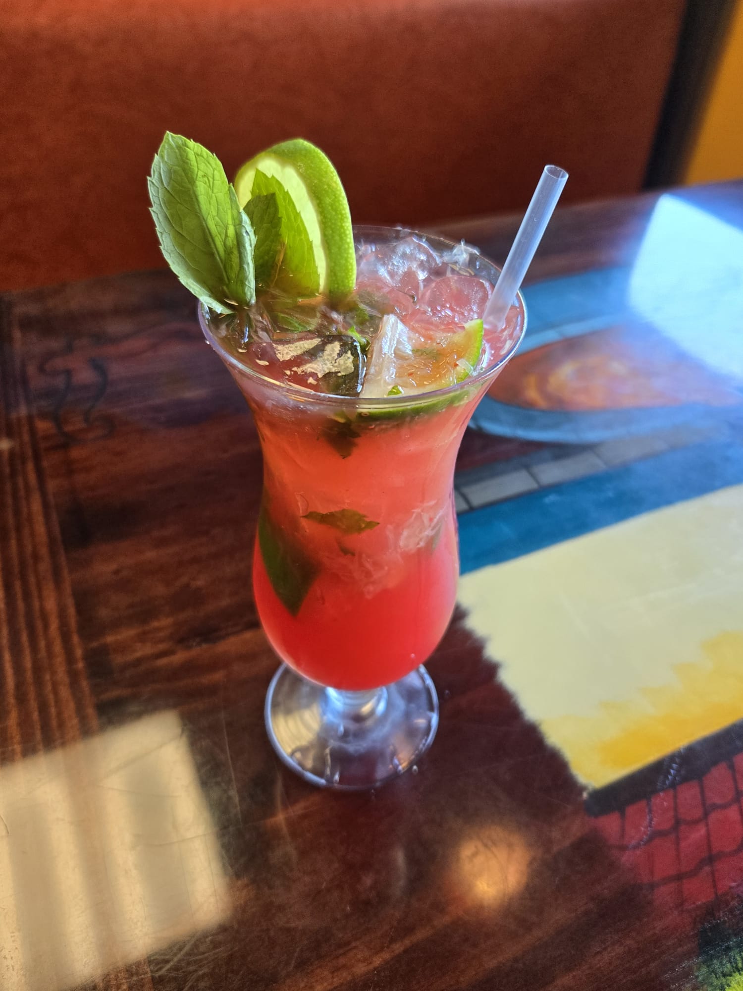 Fresh mint leaves, rum, lime juice, agave nectar and strawberry