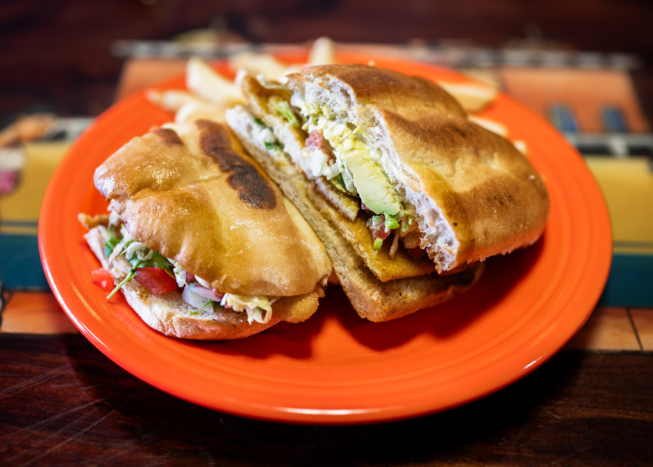 Mexican style bun with breaded chicken or steak, lettuce, tomato, onion, jalapeño, avocado, and mayo. Served with fries.